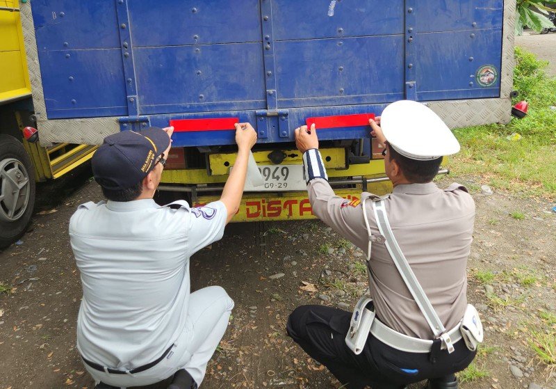 Pemasangan Sticker Reflectif ini dapat memantulkan cahaya pada saat terkena sorotan lampu, sehingga harapannya dengan setiap kendaraan bervolume besar memasang sticker tersebut maka akan menjadikan himbauan bagi kendaraan yang berada di depannya untuk menjaga jarak aman