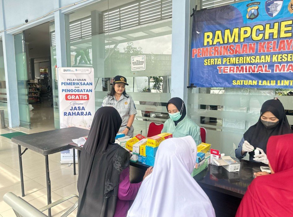 Rolasnews.com, Magetan – Jasa Raharja Kantor Cabang Madiun menyelenggarakan pemeriksaan kesehatan dan pengobatan gratis bagi para sopir, kru bus maupun calon penumpang di Terminal Kertonegoro Magetan pada Rabu (19-03-2025) . Langkah ini dilakukan sebagai upaya mencegah kecelakaan lalu lintas, terlebih jelang arus mudik lebaran Idul Fitri. Selain menjelan momentum Idul Fitri 2025, kegiatan ini rutin dilaksanakan oleh Jasa Raharja sebagai upaya kepedulian terhadap keselamatan transportasi. Seperti kegiatan-kegiatan sebelumnya, kali ini juga mendapat perhatian dan apresiasi dari sopir, kru dan calon penumpang. Tak kurang dari 70 orang ikut serta dalam pemeriksaan kesehatan gratis ini. Pemeriksaan kesehatan yang meliputi pemeriksaan tensi, gula darah, asam urat, dan kolesterol. Selain itu, peserta juga mendapatkan obat-obatan secara gratis sesuai dengan anjuran dari dokter.