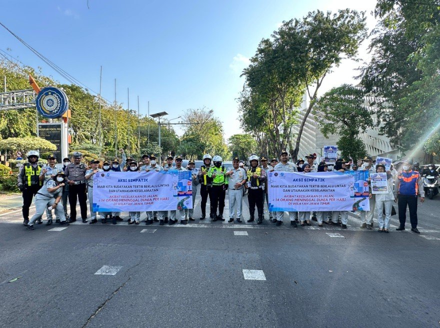 Rolasnews.com, Surabaya – PT Jasa Raharja Cabang Surabaya berkolaborasi Bersama PT Jasa Raharja Kantor Wilayah Utama Jawa Timur menggandeng Polrestabes Surabaya dan Dinas Perhubungan Kota Surabaya menggelar kegiatan Aksi Simpatik pada hari Jum’at, 25 Juli 2025 bertempat di Jalan Raya Simpang Darmo Kebun Binatang Surabaya dengan memberikan Coklat dan Souvenir berupa Gantungan kunci yang bertuliskan Pesan Keselamatan Berlalu Lintas kepada pengguna jalan yang melintas di Jl Raya Darmo Surabaya.